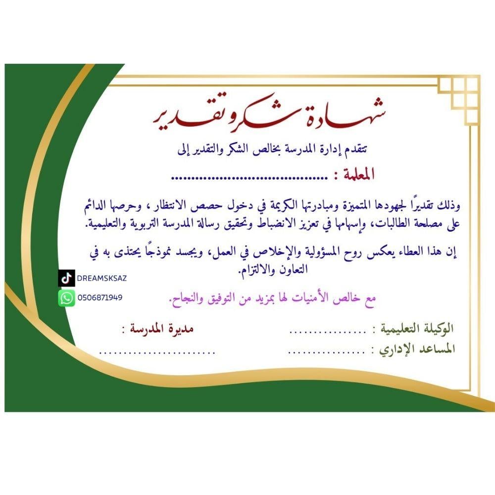 - تصميم شهادة شكر للمعلمة لحصص الانتظار pdf وبوربوينت